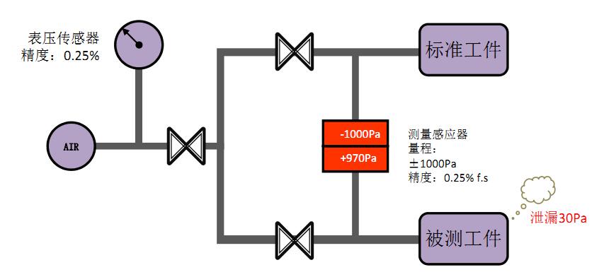 基本原理:將一定壓力的氣體,同時(shí)沖入相等容積的標(biāo)準(zhǔn)工件和被測工件內(nèi),關(guān)閉閥門,經(jīng)過平衡穩(wěn)定后,測量標(biāo)準(zhǔn)工件與被測工件的氣壓差值,該差值即是實(shí)際泄漏值,因取得氣壓差值的感應(yīng)器是獨(dú)立的,所以該測試方法不受充氣壓力的影響和限制,并且精度比較高。